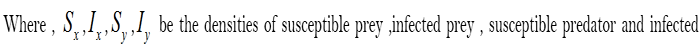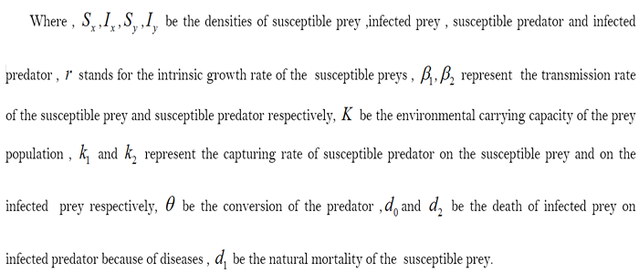 Mathematical ecology and mathematical epidemiology are major fields of study. Since transmissible disease in ecological situation can’t be ignored, it is very important from both the ecological and the mathematical points of view to study ecological systems subject to epidemiological factors. A number of studies have been performed in this field; However, all these papers available only discussed the disease spread in a species ,seeing [1-3] deal with the disease is spread among the predator population only ,but in literatures [4-7] the disease is spread among the preys population considered. In our common life ,the disease may spread among the prey and the predator. On the basic of this ,this paper deals with the prey-predator model with diseases in the prey and predator , and we suppose the predator with disease dose not capture on the preys, the susceptible predator capture both on the susceptible an on the infected prey, but the capture rate is different , which much closer to the actual situation . This paper consider the model as follows: