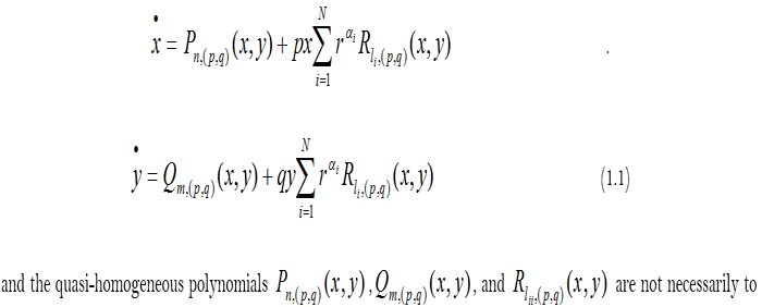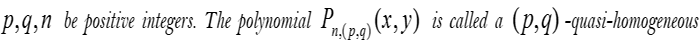 (p,q)-quasi-homogeneous of quasi-degree n vector field. Notice that homogeneous vector fields of degree n are quasi-homogeneous of quasi-degree n and weight (1, 1).
