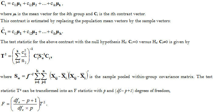 A contrast is a linear combination of two or more group means. We have a contrast among the population mean vectors µ1, µ2, …, µk, given by