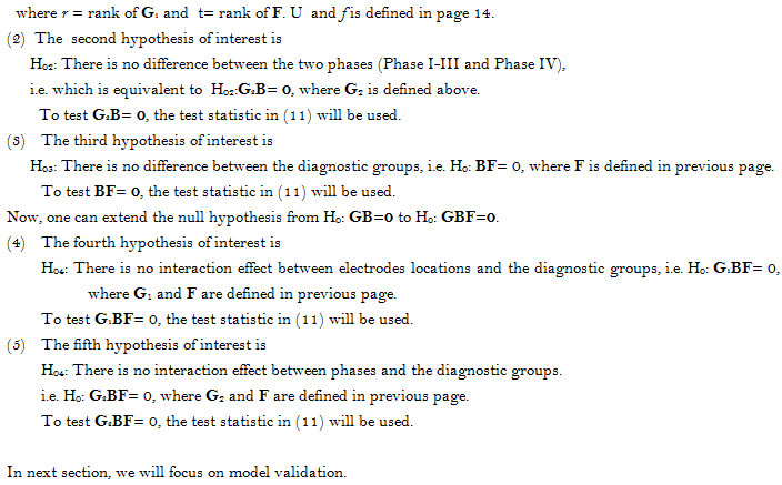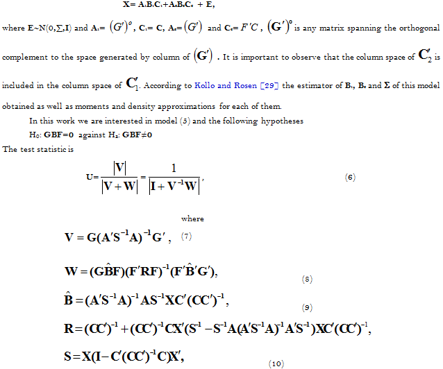 In the model X= BC + E, our interest is to test the hypothesis GB=0, where G is known and formulated according to null hypothesis . However, we shall extend the model (3) and consider