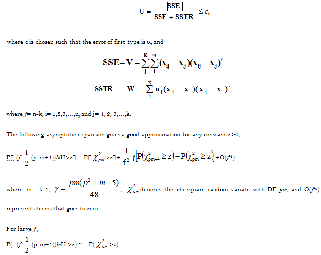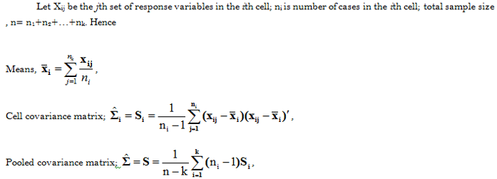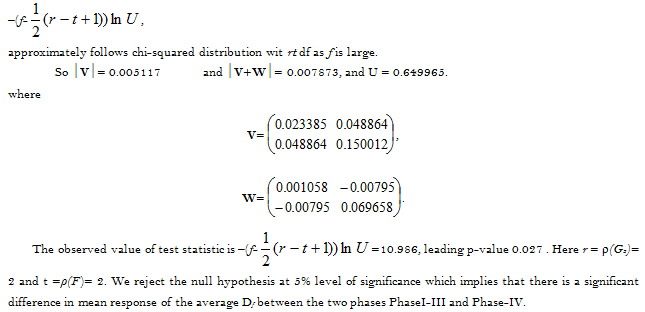 To test the following null hypothesis about equality of the mean responses with the assumption; the covariance matrices of the different groups of responses are assumed to be equal, Wilks’ lamda, Lawley-Hotelling’s trace, Pillai’s Trace and Roy’s largest root tests [28] can be used to test the equality of the mean responses. These tests, however, may become seriously biased when the assumption of equality of covariance matrices is violated.
