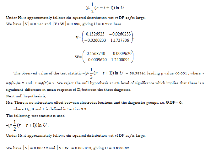 Table-5.2. Different test statistics for the null hypothesis; H0: there is no significance vector mean difference between the different diagnosis groups of the fractal dimension Df