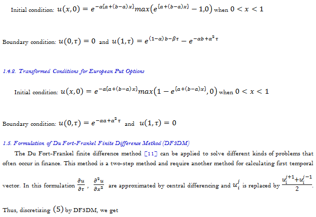 Keywords: Black-Scholes equation, European call option, European put option, Du Fort-Frankel finite difference method (DF3DM), Galerkin weighted residual method (GWRM), Modified legendre polynomials.