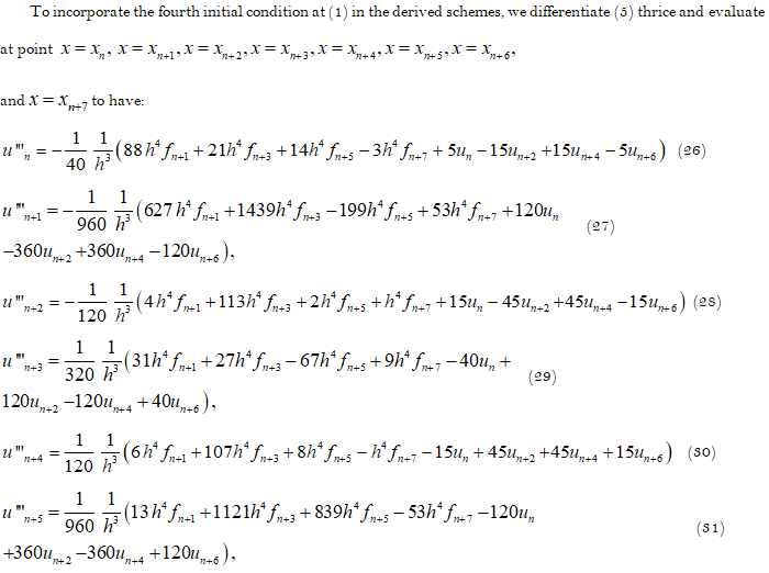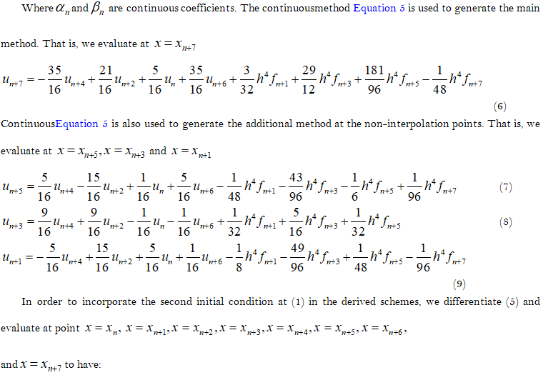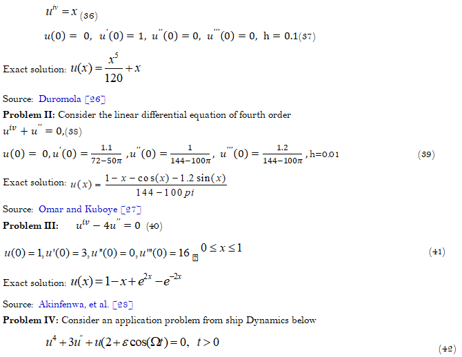 The schemes derived inEquations6, 7, 8, 9, 10, 11, 12, 13, 14, 15, 16, 17, 18, 19, 20, 21, 22, 23, 24, 25, 26, 27, 28, 29, 30, 31, 32 and 33are combined and implemented as a block in solving numerical problems of fourth order ordinary differential equations directly.