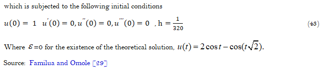 In this work, four problems weresolved. Equations 36 and 37 are the problem under consideration and the initial conditions for problem 1 correspondingly. Equations 38 and 39 represents the problem under consideration and the initial conditions for problem 2in that order, while Equations 40 and 41 denotes the problem under consideration and the initial conditions for problem 3 respectively. Equations 42 and 43 described the problem under consideration and the initial conditions for problem 4 respectively.