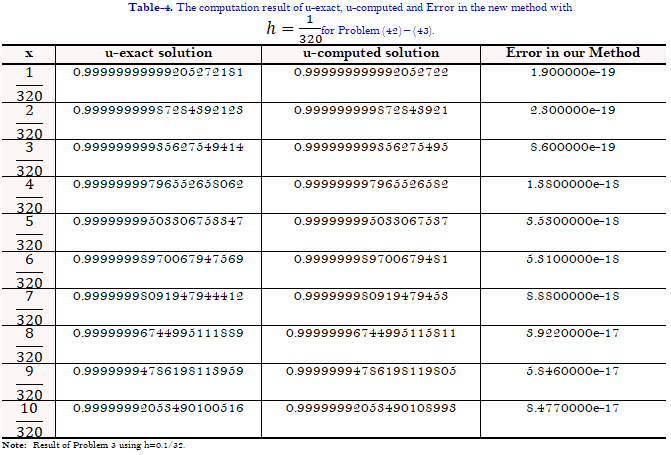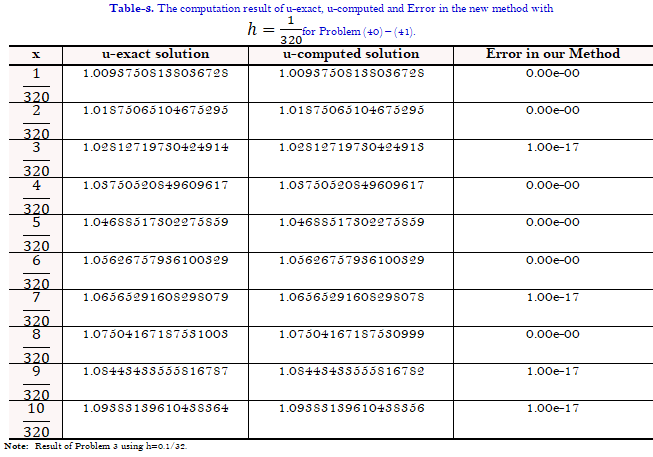 Table-1. The computation result of u-exact, u-computed and error in the new method with h = 0.1 for Problem (36) – (37).