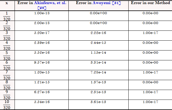 Table-7. Comparison of the new method with Akinfenwa, et al. [28] and Awoyemi [31] for solving problem (40) – (41) with h = 1/320.