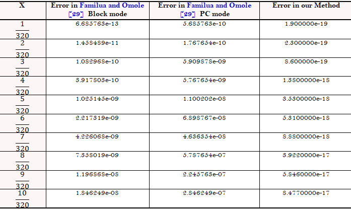 Table-8. Comparison of the new method with Familua and Omole [29] which were implemented by both block and predictor-corrector mode, for solving problem (42) – (43) with h = 1/320.