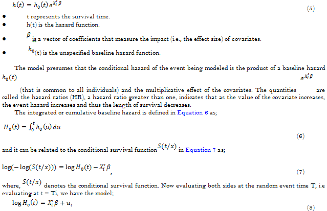 The Cox proportional hazards (CPH) model is one of the widely used models in survival analysis. It evaluates simultaneously the effect of the covariates on survival. Cox proportional hazards models links the hazard (the instantaneous rate of failure) to the covariates. In other words, it allows us to examine how specified variables influence the rate of a particular event happening at a particular point in time. This rate is commonly referred to as the hazard rate. The Cox model is expressed by the hazard function denoted by h(t) and it is usually given in Equation 5 as;