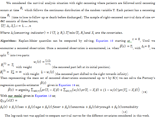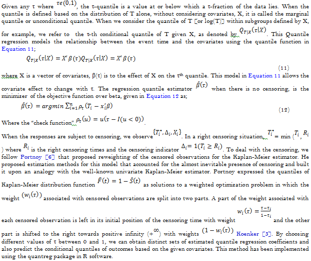 When event times cannot be fully observed due to a variety of reasons, data are subject to censoring which makes statistical estimation and inference for survival quantile regression more involved. Censoring is of different types, including; Right censoring, left censoring and interval censoring and censoring can be classified into fixed and random censoring. Any procedure which completely ignores censoring may give highly biased estimates Koenker [3]. Powell [4] first studied censored quantile regression with fixed censoring. Ying, et al. [5] proposed a semiparametric median regression model for random censoring. Despite the simplicity of the method in Ying, et al. [5] this procedure requires the unconditional independence of the survival time and censoring time. Relaxing the independence condition Portnoy [6] developed a novel estimating approach motivated by the classical Kaplan–Meier estimator in the one sample analysis. He provided a recursive estimator for right censored data, which only requires conditional independence between the survival time and censoring time given the covariates. Peng and Huang [7] also proposed a quantile regression for right censoring motivated by Nelson-Aalen estimator of the cumulative hazard function in univariate cases.
