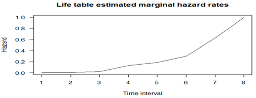 The time interval is given in days. The graph shows an increasing hazard rate (hazard rate is the theoretical measure of the probability of occurrence of an event per unit time at risk, in this paper the event is covid-19 being resolved) which implies that as time of hospitalization increases and the symptoms drops (basically due to treatment) and the patient’s potential of covid-19 being resolved increases.