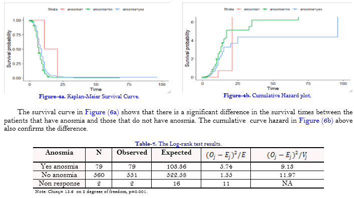 In this analysis the ‘event’ considered here is ‘discharge’ from the hospital at which time covid-19 is assumed resolved. The data set for this work relates to 641 patients diagnosed with covid-19 in Rivers State Nigeria from May 2020 to August 2020. In this covid-19 research, we estimate and infer the relationship between outcomes, say, time a covid-19 patient is admitted into the hospital to the time when he/she is discharged from the hospital (denoted by T(survival time)), and various covariates, like sex, age, fever, anosmia (absence of taste and smell), comorbidity (presence of hypertension and or biabetes) and dry-cough. The individuals admitted in the hospital and their data were available up until the end of August 2020, by which time 9 (1.4%) cases were censored while 632 (98.6%) cases were resolved and discharged from the hospital.