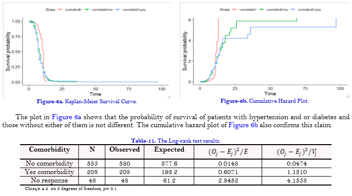 The patients that had hypertension and or diabetes were hospitalized between 7-8 days with a median of 7 days while those without hypertension and or diabetes were hospitalized between 7-9 days with a median of 7 days before the covid-19 issue was resolved. This confirms the results of the log rank test that those with or without the presence of comorbidity had the same survival time.