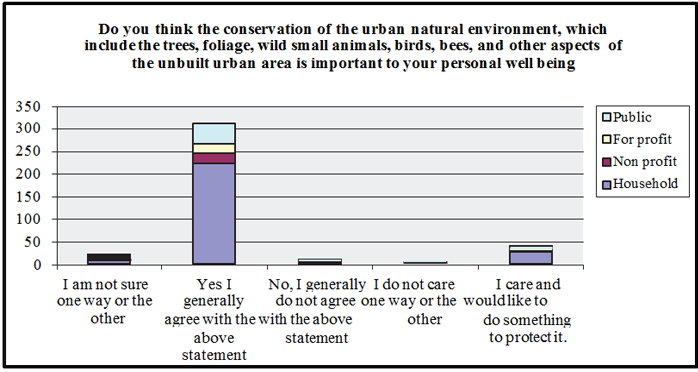 In general, the results provide some insight into the three broad statements indicated as follows: the natural environment and the urban tree cover is an important element within the ecosystem. From the frame of reference stand point, the sectors that are willing to take actions to increase the urban tree canopy and positively influence sustainability is somewhat predictable. Environmental awareness and knowledge of the urban forest has positive effects.