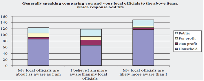 Figure 8, details relative awareness based on perceptions of respondents and their local officials. A telling response is the household frame of reference expectations of their local officials more aware as a whole. Table 5, is an aggregate of Harris County residents, notwithstanding frame of reference of response, in respect to the 12 elements of sustainability. Columns one and three are key responses in this question.