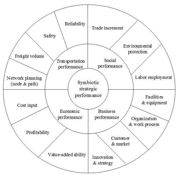In the clock model from the perspective of symbiosis, the core is symbiosis strategic performance, and apply in the layout evaluation of China-European trade hub port, which is mainly evaluated from four aspects, namely, transportation performance, social performance, economic performance and business performance. According to the Metafrontier analysis framework (Chang and Tovar, 2017) port performance evaluation includes input (labor force, labor facilities, mobile equipment and other assets), output (transportation volume under various transportation modes), and possible technical differences. Combined with the characteristics of CR Express and the symbiosis theory, the performance evaluation of hub-port is finally divided into the above four parts.