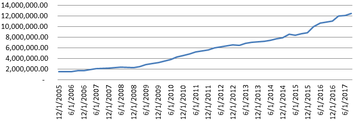 Nigerian government embarked on extensive borrowing in the last decade in order to finance its budget deficit. Figure 1 indicates the increasing trend in Federal Government domestic debt from 2005 to 2017. It shows that federal government domestic debt increased astronomically from N1.525 trillion in 2005 to N3.228 trillion in 2010 and stood at N12.496 in September 2017.