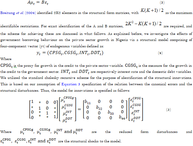 In terms of empirical analysis, Structural Vector Auto-regressions (SVAR) model was utilised to analyse the dynamics between government borrowing behaviour and private sector growth in Nigeria. The results from impulse response functions and variance decomposition appear to provide robust evidence that government borrowing behaviour has the tendency of impacting negatively on the effectiveness of private sector growth in Nigeria. This is a clear confirmation of the popular crowding-out effect.