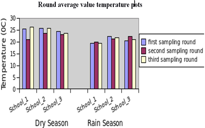 The Figure 3 depicts the results of the round-sampling of ambient air temperature by considering rain and dry season in all school. It indicates generally that the level of temperature for rainy season is law compared to that for dry season while Figure 4 illustrates the round-sampling for ambient CO2 concentration by considering rainy and dry season in all school. The figure indicates generally that the level of ambient CO2 concentration of the rainy season is high compared to that of dry season. Considering each school’s levels with respect to season we have the following discussion.