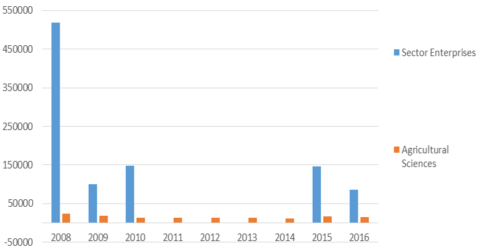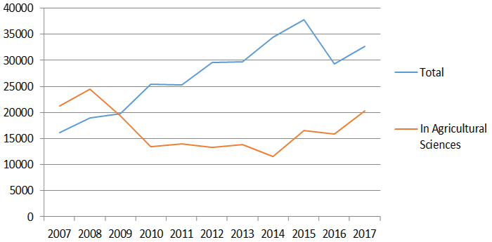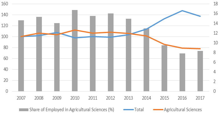 In the past years the expenditures for R&D activity in „Agricultural Sciences“ have diminished considerably both absolutely as well as a relative share in the total expenditures for R&D activity in the country Figure 1. While the overall amount of the expenditures for R&D activity has increased almost three times after 2007, the expenditures for R&D activity in „Agricultural Sciences“ have diminished with 45% until 2014, and demonstrate a growth afterwards reaching a three-quarters of the initial level in 2017.