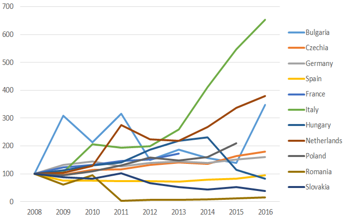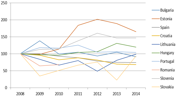 Figure-4. Evolution of intramural R&D expenditures in sector “Agriculture” in EU member states (2008=100).