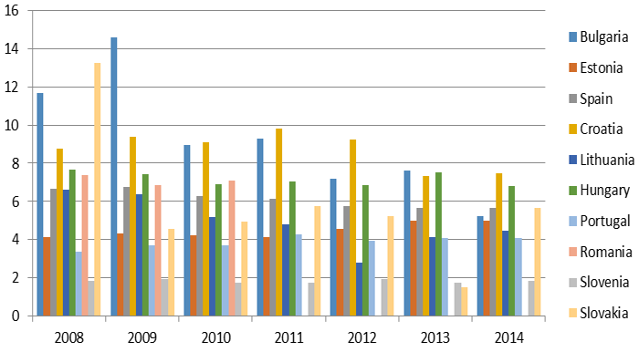 These trends in the evolution of agrarian R&D activity in Bulgaria are similar to other EU member states like Spain, Croatia, Slovakia and Lithuania, where it has been registered diminution of expenditures for R&D activity in agriculture in the last years Figure 4. At the same time in certain EU member states like Estonia, Hungary, Slovenia etc. there has been a significant growth in the overall expenditures for R&D activity in the sector.