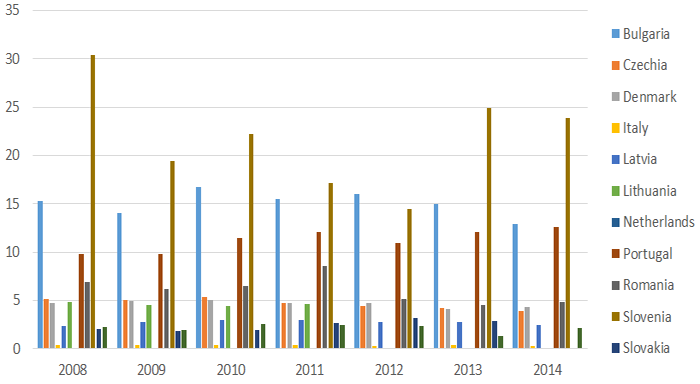 However, in Latvia, Portugal and Slovakia there is a reverse trend of enlargement of the later proportion. Slovenia, Bulgaria and Portugal are countries with the greatest relative share of employed in agricultural sciences in the overall employed in R&D activity.