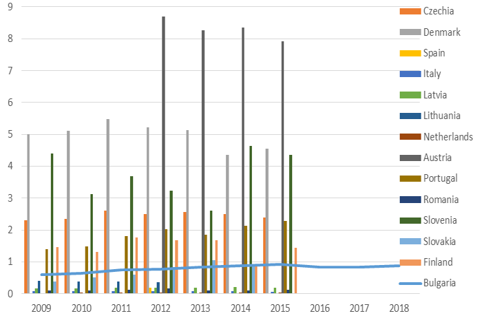 In most EU member states during the period 2009-2016 a stable level of science endowment is observed measured by that indicator. In some countries, like Italy, Spain, Latvia, Netherlands and Romania, the proportion of employed in agrarian R&D activity in relations to the overall involved in the sector, is much lower than in Bulgaria. In Slovakia, the level of this indicator is similar to Bulgaria during the good part of the analyzed period.