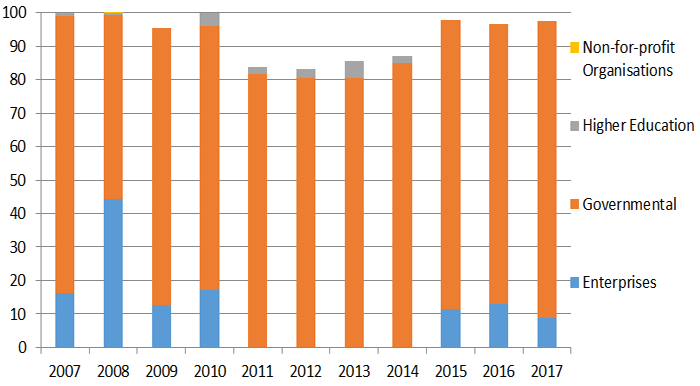 The most important sector of agricultural R&D activity in Bulgaria is the Governmental sector, in which the greatest part of the total expenditures of R&D activity in the sector are invested Figure 12. With an exception of 2008 during entire period after EU accession of the country, in the later sector are allocated more than 80% of overall expenditures for agrarian R&D activity. That sector comprises mostly research and development organizations, funding their activities from the state budget by priorities determined by the state.