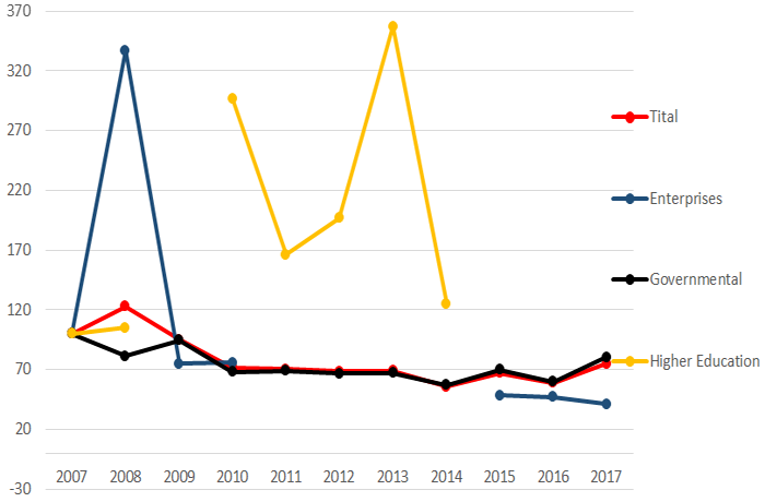 Since 2007 personnel employed in R&D activity in the area of „Agricultural Sciences“ initially augment (up to 12% in 2010), and gradually decreases afterwards to 78% of the initial level in 2017 Figure 2. That indicates deteriorating of the staff component of R&D activity in agrarian sphere in recent years.