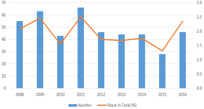 There are no statistical data doe distributions of the number of workforce in the public (state and university) sector of agrarian R&D activity, but merely in the sector of Enterprises. In the private sector are employed a small portion of the totally involved in agrarian R&D activity in Bulgaria Figure 15. The amount of that personnel is little, while their number and share in the overall persons and researchers, engaged in agrarian R&D activity vary considerably in individual years (from 28 to 66 persons, and between 1,3% and 2,5%).