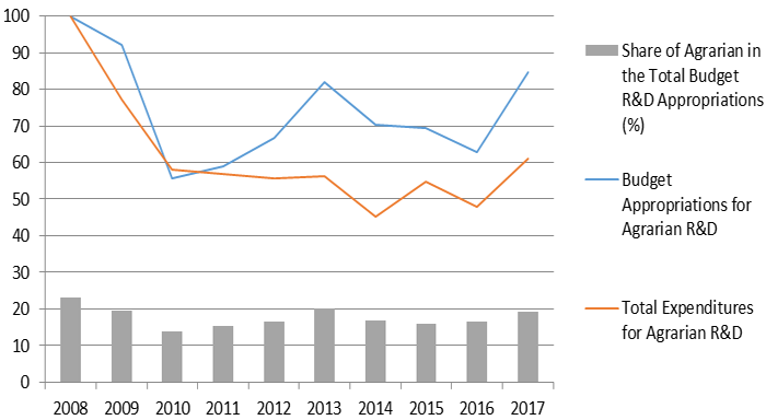 At the same time however, there is a fall in the share of budget appropriations for R&D activity for „Development of Agriculture, Forestry and Fishery“ sector in the total budget appropriations for development of R&D in the country. What is more, the share of agrarian funding of R&D activity from the national budget is quite fluctuating as initially dramatically falls (from 23% in 2008 to 13,9% in 2013), and after that increases a little bit (up to 19,2% in 2017). These figures give insight for the diminishing social significance of agrarian R&D activity and their unsustainable funding by the national budget.