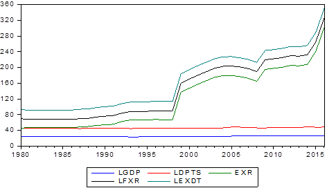 Where: GDP = Real GDP; EXDT = Foreign Debt Stock; DSPT = Foreign Debt Service Payments; EXRT = Exchange Rate; FXGR= foreign exchange and gold reserve.