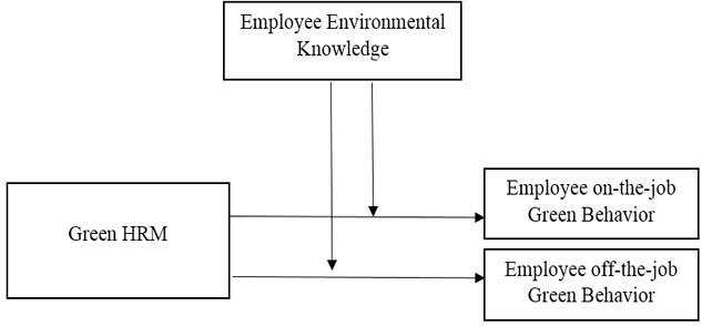 Existing empirical studies have examined the effects of green HRM on individual performance such as employee pro-environmental behavior (Saeed et al., 2019; Safari, Salehzadeh, Panahi, & Abolghasemian, 2018; Suganthi, 2019) in-role and extra-role green workplace behavior (Aboramadan, 2020; Dumont et al., 2017; Zhang, Luo, Zhang, & Zhao, 2019) task related green behavior and voluntary green behavior (Chaudhary, 2019) organizational citizenship behavior (Hameed et al., 2020) and environmental performance (Gilal et al., 2019; Rawashdeh, 2018). Nevertheless, the scholars have paid little attention on the effects of green HRM practices on employees’ off-the-job green behavior in addition to the on-the-job green behavior. But, many pro-environmental behaviors demonstrated outside the workplace settings like personal lives are found similar to those displayed inside the workplace settings (Paillé, Raineri, & Boiral, 2017). Environment friendly behavior like purchasing organic foods, recycling materials, and saving water and energy may stem from the learning, experiences, routines, and habits acquired inside the workplace. But little attention has been paid to discover how the environmental experience learned from the workplace settings can be transmitted in the non-work settings, such as home-work, transport, education, and consumption. Consequently, the current study addresses the gap by exploring how the organizational green initiatives like green HRM affect employee green behavior both on-the- job setting and off-the-job settings. Even the prior studies have explored the moderating role of individual green values (Dumont et al., 2017; Gilal et al., 2019; Hameed et al., 2020) environmental values and gender (Chaudhary, 2019) on the relationship between green HRM and employee green behavior. Few studies have shown how the environmental knowledge can moderate the effects of green HRM on employee pro-environmental behavior. But, employee environmental knowledge is expected to positively moderate the relationship between green HRM practices and pro-environmental behavior (Saeed et al., 2019). Hence, the current study aims to discover whether employee environmental knowledge can influence the link between green HRM and employee green behavior.