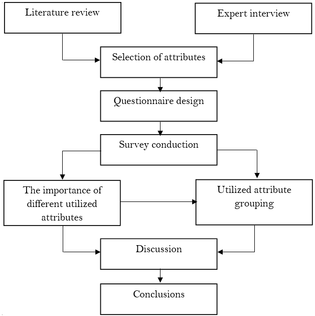 To fulfill the research goal, based on the literature review and experts’ opinions through in-depth interviews, attributes affecting residents’ behaviors and preferences for e-waste recycling services were selected. The research targets five large common e-waste originating from refrigerators, air conditioners, washing machines, desktop computers, and television sets. The questionnaire was then designed and included three sections. The introductory part provides respondents with general pictures about e-waste, the importance of its proper collection and treatment, and an introduction to a proposed e-waste recycling program. The second section is about the attributes affecting residents’ behaviors and preferences for e-waste recycling services. A five-point Likert scale was used to weigh the level of the importance of each attribute, which ranges from 1 for “not very important” to 5 for “very important”. The last section of the questionnaire is to collect the personal information of respondents, including gender, age, level of education, average income, household size, and living area. Before conducting the official interview, the questionnaire was sent to two experts and twenty residents for doing a pre-test survey. According to the comments and feedback collected through this trial, revisions and corrections were made to ensure the feasibility of the questionnaire. Data obtained from the interview was then analyzed and the level of importance of different utilized attributes on residents’ preference for proposed e-waste recycling services was evaluated by ranking mean value of each attribute. A factor analysis technique was employed to classify attributes into descriptive categories with common characteristics. Factor analysis is a multivariate technique, aiming to identify underlying variables, in turn, explain the pattern of correlations within a set of observed variables. Factor analysis is often used in data reduction to identify a small number of factors that explain most of the variance that is observed in a much larger number of manifest variables. The research process is illustrated in Figure 1.