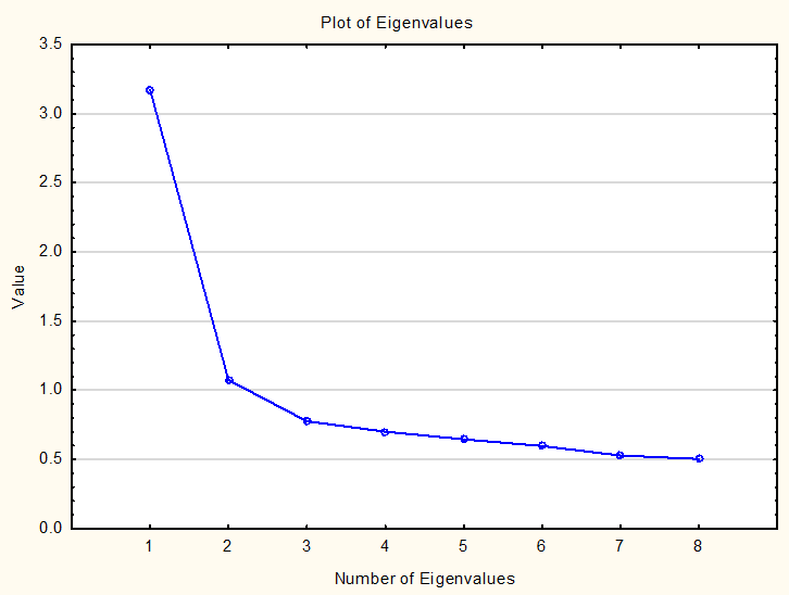 Factor analysis was employed to explore the relationships between eleven chosen attributes discussed above. Principal components extraction method with the varimax rotation was performed on the 11 attributes and suggested the two factors. However, there were two attributes with factor loading lower than 0.500 (A4 and A10) and thus, excluded from the model. With a model of the 9 attributes left, there were also 2 factors extracted from this second run of factor analysis, in which Factor 1 contains 5 attributes (A1, A2, A7, A 9, A11) and Factor 2 includes 4 attributes (A3, A5, A6, A8). To check the reliability, or internal consistency, of a set of attributes in each factor, Cronbach’s alpha was adopted, with a widely accepted value of greater than 0.6 (Hair, 2010). The research’s results show that while Cronbach’s alpha of Factor 2 satisfies the desired value, that of Factor 1 cannot pass the test. The reason is that Cronbach's alpha if item deleted of A11 in Factor 1 is higher than the overall Cronbach’s alpha of Factor 1 (0.709 compared to 0.687, respectively). Therefore, to ensure the internal consistency of all attributes in Factor 1, A11 was removed, and there were four attributes left in Factor 1. The subsequent factor analysis of eight remaining attributes suggests a two-factor model, together explaining 53.088% of the total variation, with the Eigenvalues of Factor 1 and Factor 2 being 3.173 and 1.075, respectively. Figure 2 illustrates the line graph of the Eigenvalues in order to perform Cattell's scree test. It can be seen that the point could be at Factor 2 where the continuous drop in Eigenvalues levels off suggests the cutoff (>1).