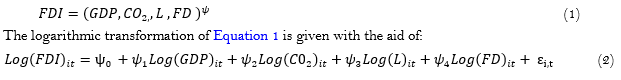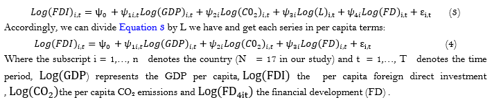 A typical model examining the effect of FDI on the environment has the form of Equation 4. In this case, economic growth, the environmental regulation, and the level of financial development (FD) have a great impact on FDI flows (see, (Abdouli & Omri, 2021; Anwar & Sun, 2011; Lee, 2013; Olusanya, 2013; Omri & Sassi-Tmar, 2015; Pao & Tsai, 2010) ).