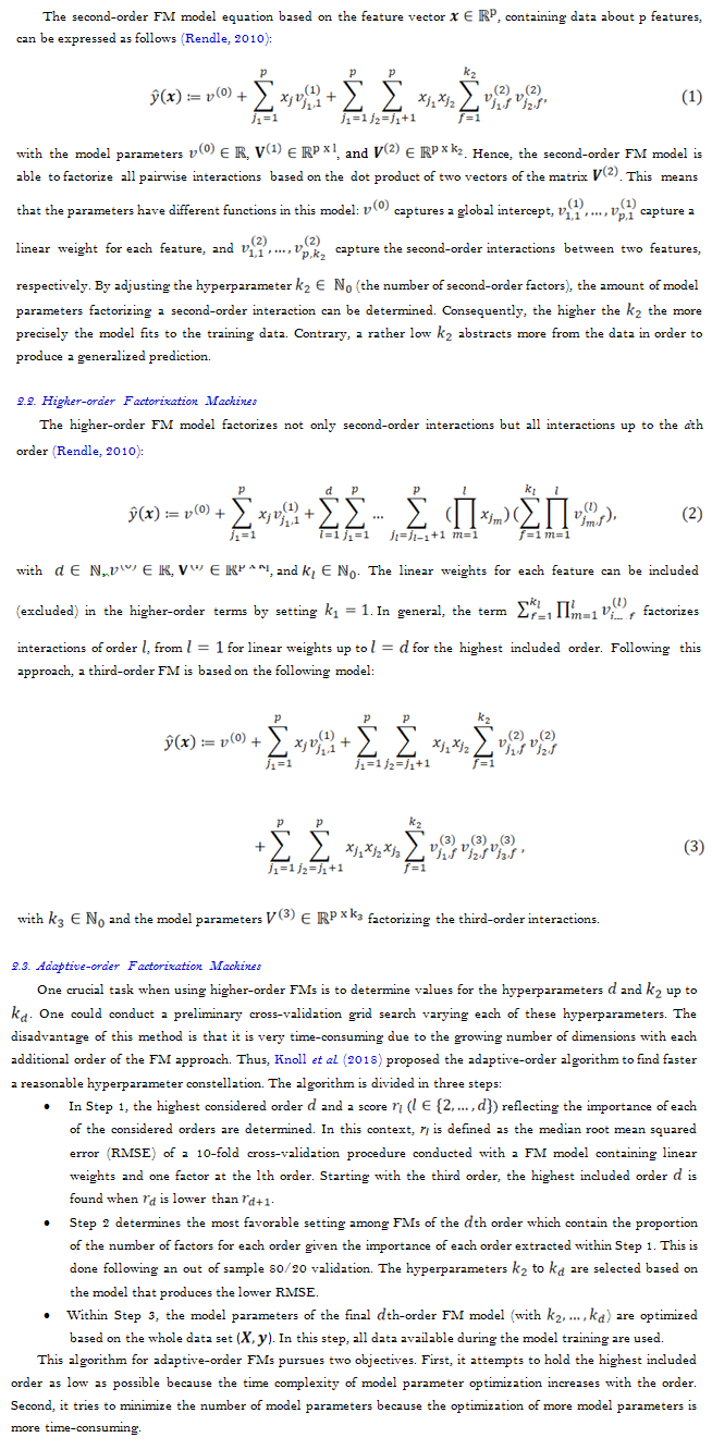 In the following, we describe the well-known second-order FM model (Rendle, 2010) as well as the higher-order FM approach (Knoll, 2016b) which is a more complex generalization of the second-order FM model. Furthermore, we explain how to find the necessary hyperparameters employing the adaptive-order algorithm and give an insight in the typical learning methods used to optimize FM models.