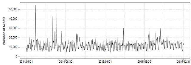Figure 1 reports the number of tweets over the analyzed time period. On average, we observe approximately 15,000 tweets per day over time. However, there still exist a few outliers caused by changes in the stock market, e.g., we find a peak with over 50,000 tweets per day on the 19th of May 2014 – not surprising since AT&T Inc. presents a takeover offer for the DirecTV Corporation on this day. These strong reactions via Twitter can be explained by the fact that DirecTV Corporation supplies a daily commodity service which is used by a large audience.