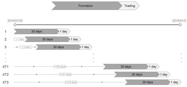 Figure-2. The empirical application consists of 473 overlapping study periods from January 2014 to December 2015. Each study period is built up of a 30-day formation and a 1-day trading period.
