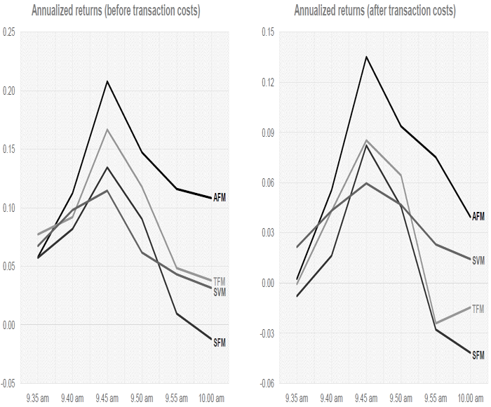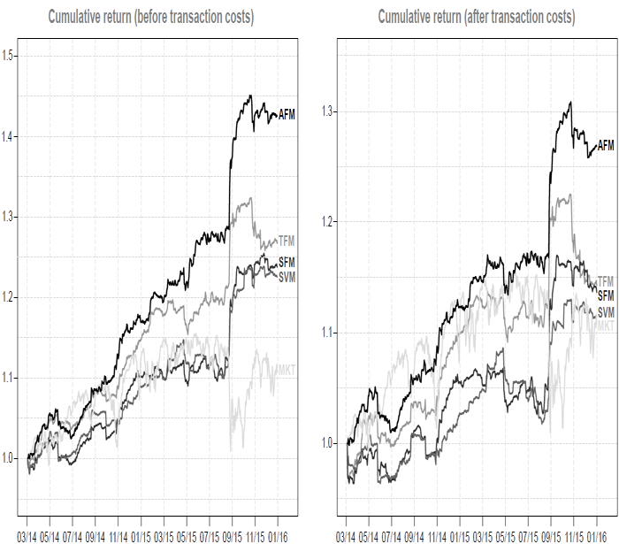 Table 1 depicts daily risk-return measures for the analyzed period both before and after the incorporation of transaction costs. The majority of the metrics can be found in Bacon (2008). Irrespective of the FM model employed, we observe positive returns after transaction costs ranging between 2 bps per day for SVM and 5 bps per day for AFM, compared to 3 bps for a naive buy-and- hold strategy of the S&P 500.