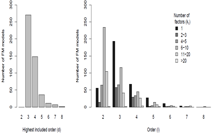 In order to analyze the impact of the factors per order of the AFM model, Figure 7 shows a summary of the particular FM models optimized for the 473 trading periods. The left plot expresses the characteristics of the highest included order among the FM models chosen, while the right diagram presents the number of FM models