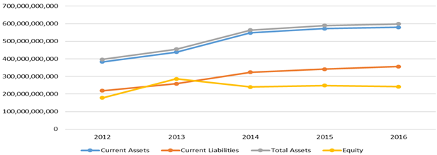 Figure 2 also shows that the average of assets (current assets and total assets), liabilities (current liabilities), and equity underwent fluctuation with an upward trending during 2012-2016.
