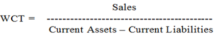 Working Capital Turnover (WCT) WCT is a ratio that measures business activity against excess current assets for current liabilities and shows the number of sales that the company can obtain (in Indonesian rupiah) for each rupiah working capital (Sawir, 2001). The ratio of working capital turnover is therefore a comparison between sales and current assets minus current debt. The greater the working capital turnover ratio, the more efficient is the working capital used to finance the company's business activities. In practice, current liabilities in insurance industry are different from current liabilities measured in theory. According to PSAK No.28 about general insurance accounting, there is no difference between current liabilities and long term liabilities as used in a common balance sheet. The formula of working capital turnover is :