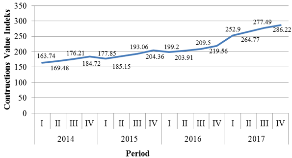 The value of the construction sector depends on the work realization of projects completed within a quarterly period. The construction value index for the first quarter of 2014 until the fourth quarter of 2017 shows results that fluctuate with a tendency to increase. The fluctuations in the construction value index completed by the construction sector in Indonesia are shown in Figure 1: