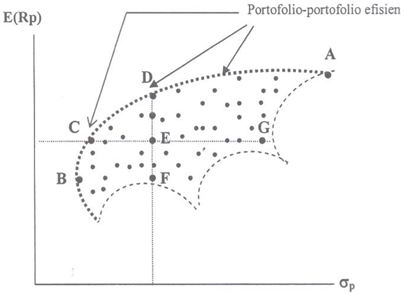 From Figure 4, investors will choose portfolio D compared to portfolio E or portfolio F. Portfolio E is better than portfolio F and portfolio D is better than portfolio E, because with the same risk, the expected return of portfolio D is higher than the expected return of portfolios E or F. Thus, portfolio D is an efficient portfolio. In the same way it can also be explained that portfolio C is better than portfolio E or portfolio G. Portfolio E is better than portfolio G and portfolio C is better than portfolio E, because with the same expected return, the portfolio risk of C is smaller than risk of E or G. Thus, portfolio C is an efficient portfolio. In the same way, it can be determined that the points on curves A through B will contain efficient portfolios.