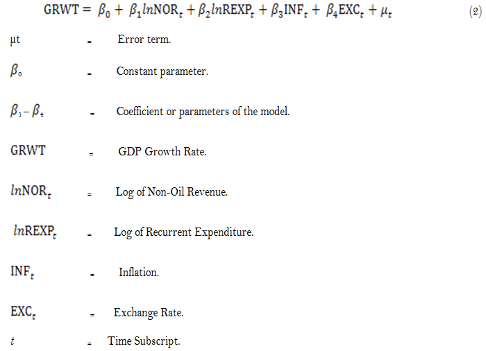 This study in view of its nature made use of secondary data. Annual time series data from 1981 to 2018 were sourced from the Central Bank of Nigeria’s Statistical Bulletin. The series Growth rate (GDP growth) and inflation rate were sourced from united nation conference on trade and development (UNCTAD) from 1981-2018. The dependent variable is the GDP growth rate and is used in measuring economic growth. The independent variables are measured as follows: Non-oil Revenue (NOR) which is a measurement for the Non-Oil Revenue, Recurrent Expenditure (REXP), Inflation rate (INF) and official exchange rate of the naira to the US dollar was used as a proxy for exchange rate.