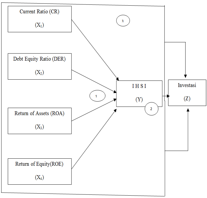 H1: Allegedly, there is a significant positive effect on the partial current ratio (CR) partially on the Individual Stock Price Index (IHSI). H2: Allegedly, there is a significant positive effect on the variable Debt of Equity Ratio ( DER) partially on the Individual Stock Price Index (IHSI). H3: Allegedly, there is a significant positive influence on the variable Return On Assets (ROA) partially on the Individual Stock Price Index (IHSI). H4: Allegedly, there is a significant positive influence on the variable Return On Equity (ROE) partially on the Individual Stock Price Index (IHSI). H5: Allegedly, there is a significant positive influence on the variable Current Ratio (CR) partly on Investment (INV). H6: Allegedly, there is a significant positive effect on the variable Debt of Equity Ratio (DER) partial to Investment (INV). H7: It is suspected that there is a significant positive influence on the variable Return On Assets (ROA) partially on Investment (INV). H8: Allegedly, there is a significant positive influence on the variable Return On Equity (ROE) partially on the individual investment (INV). H9: Allegedly, there is a significant positive effect on the variable Individual Stock Price Index (IHSI) partially on Investment (INV). H10: It is suspected that there is a substantial influence on the variable Current Ratio (CR), Debt of Equity Ratio (DER), Return On Assets (ROA), Return On Equity (ROE) simultaneous effect on H11 Individual Stock Price Index (IHSI): Allegedly there is a significant influence on the variable Current Ratio (CR), Debt of Equity Ratio (DER), Return On Assets (ROA), Return On Equity (ROE) and Individual Stock Price Index (IHSI) simultaneously on Investment (INV) 12. H12: Allegedly, there is a significant influence on the variable Individual Stock Price Index (IHSI) simultaneously on Investment(INV).The research design used in this study is causal research that aims to determine the effect of two or more variables. The variables used in this study consisted of independent variables (CR, DER, ROA and ROE, dependent variable IHSI, and Investment variable (INV).