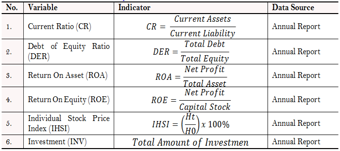 Operational Definition and Variable Measurement Following the framework of the factors affecting the Individual Stock Price Index (IHSI) in this study are CR, DER, ROA, ROE, IHSI, and INV, titled Factors Affecting the Individual Stock Price Index (IHSI) of the Manufacturing Industry sub-sector Automotive and Component sectors from the Indonesia Stock Exchange from 2014 to 2018.