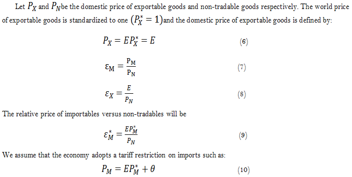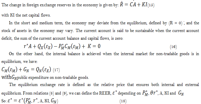 The FEER approach is well recognized for the calculation of equilibrium real exchange rates. We follow Edwards (1989) in the definition of the REER, which results from the simultaneous realization of the internal and external equilibrium of the economy. A small open economy with three types of goods: as exportable goods, as importable goods and non-tradable goods. The economy produces exportables and non-tradables and consumes non-tradables and importables.